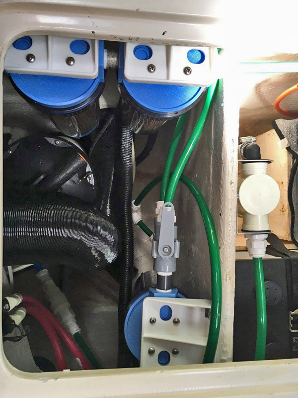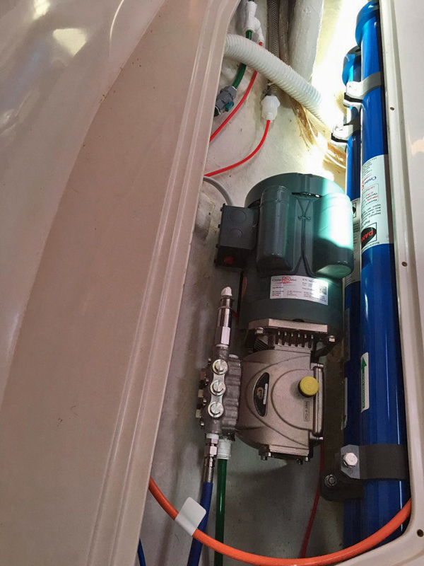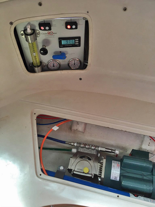 We found a great place under the port Saloon settee for the high pressure pump and membranes, and forward of that we placed the boost pump, filters and valving. Behind the seat back is a little cubby that is perfect for the control panel with pathway for the electrical and tubing to get to where they needed to go.