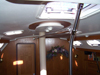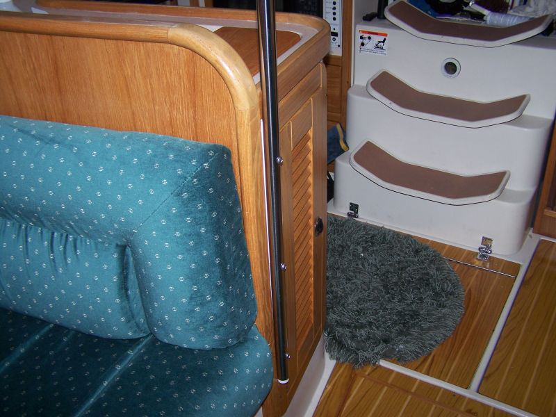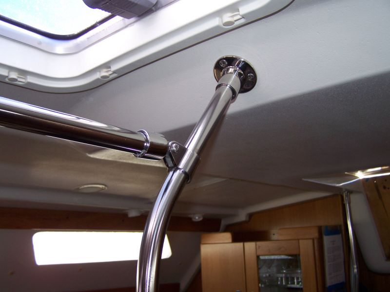 I wanted a pole like the Catalina 470s have and came up with this idea. I bent a piece of 3/4 inch EMT electrical conduit to get the bend and then bent the stainless tubing filled with sand with a one inch EMT bender as a bonus. On a port tack, you can lean into the pole with one arm around it to use the sink. On a starboard tack, you can put your arm as a wing and hold on while using the sink from the bottom of the steps to the pole. It is very convenient.