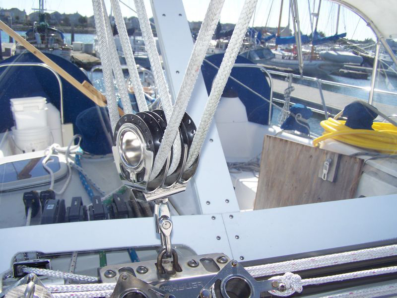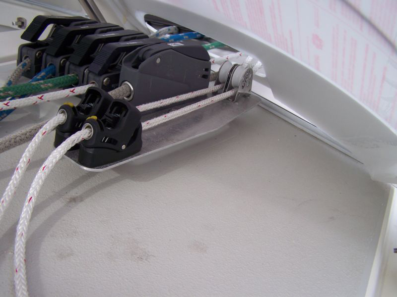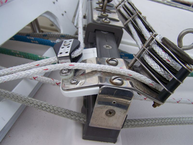 Traveler mod to one side. The Spinlock PXRs are rated for a 400 lb load and 3/8 inch line and the traveler has a 4 to 1 purchase.